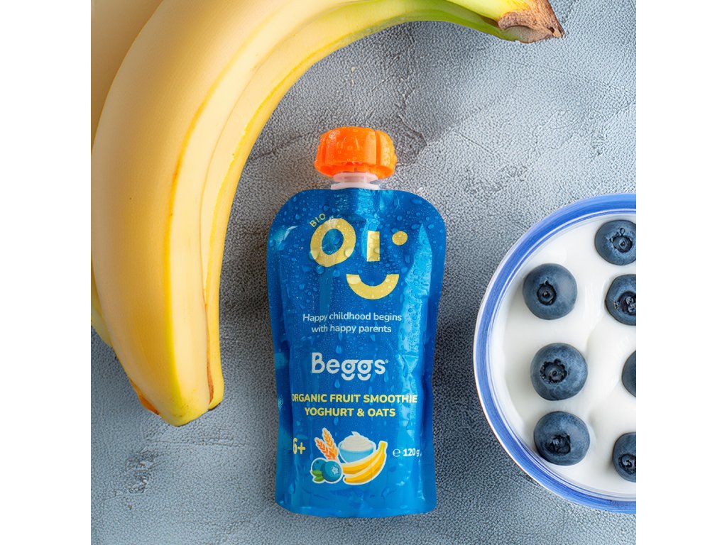 Beggs BIO Smoothie s ovocem, jogurtem a ovesnými vločkami (120 g), ovocno-obilný příkrm s jogurtem od ukončeného 6. měsíce.
