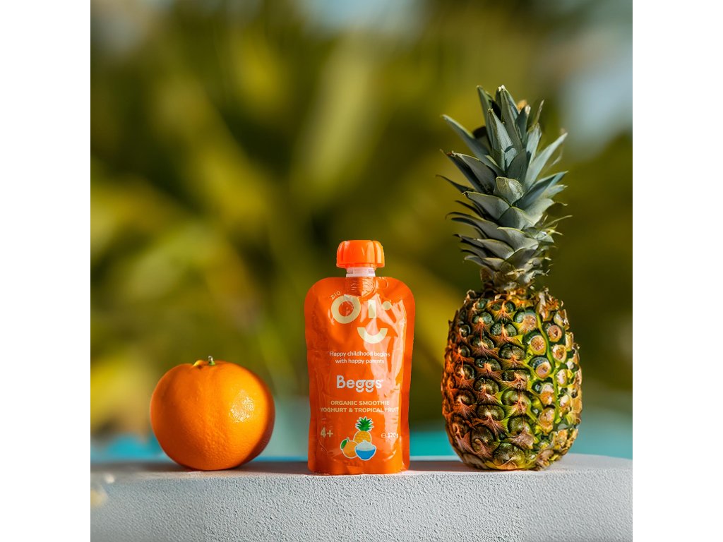 Beggs BIO Smoothie s jogurtem a tropickým ovocem (120 g), ovocno-obilný příkrm s jogurtem od ukončeného 4. měsíce dle doporučení pediatra.