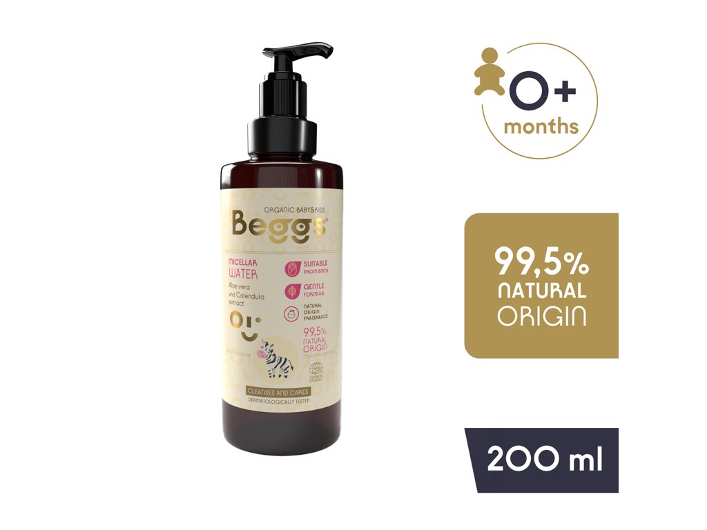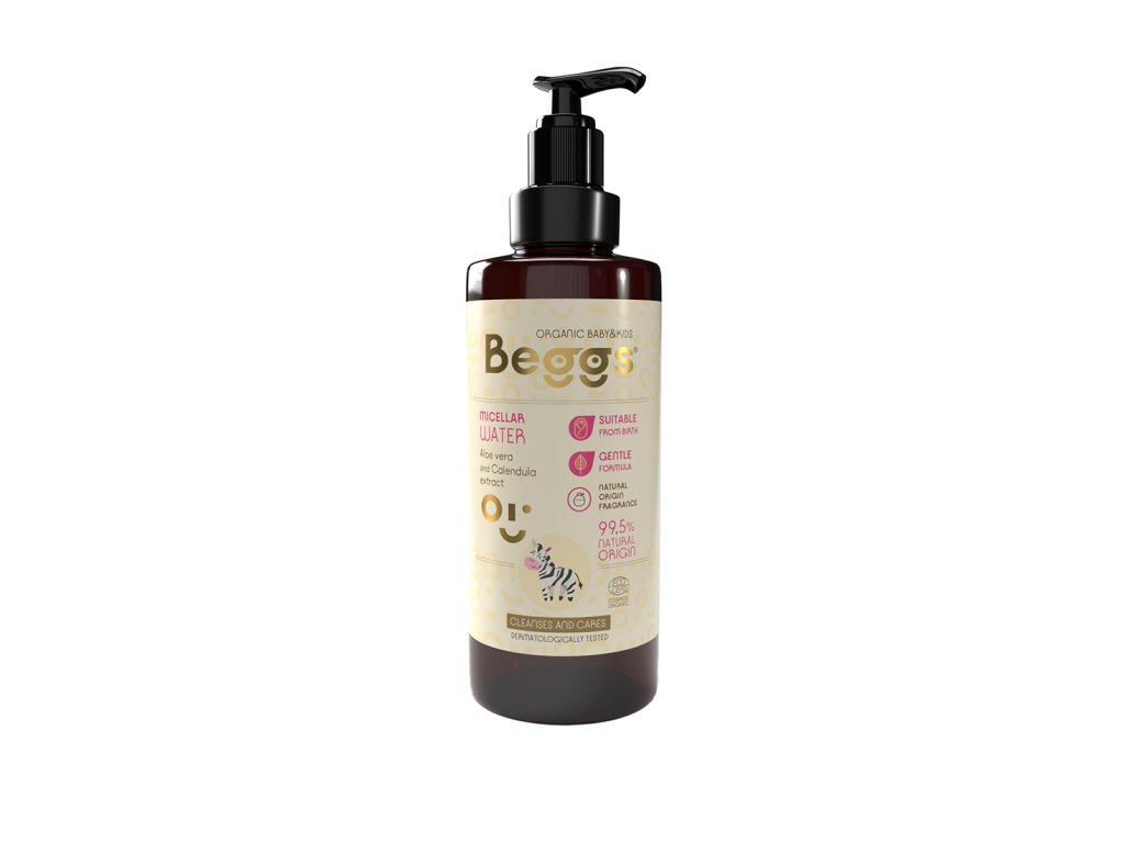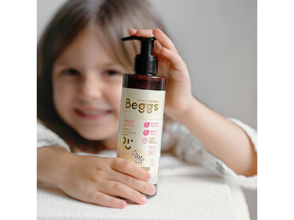 Beggs Dětská micelární voda je vhodná k očištění pokožky celého těla, obličeje, ale i plenkové oblasti. Obsahuje aloe vera šťávu, která podporuje hydrataci pokožky, vyživuje ji a chrání. Dále obsahuje extrakt z květu měsíčku lékařského, který má zjemňující a zvláčňující účinky. Obě složky pochází z kontrolovaného ekologického zemědělství (BIO) a 99,5 % složek v balení je přírodního původu. Voda krásně voní, neoplachuje se a nezanechává lepkavé stopy. Proto je vhodná například i při cestování s dětmi.