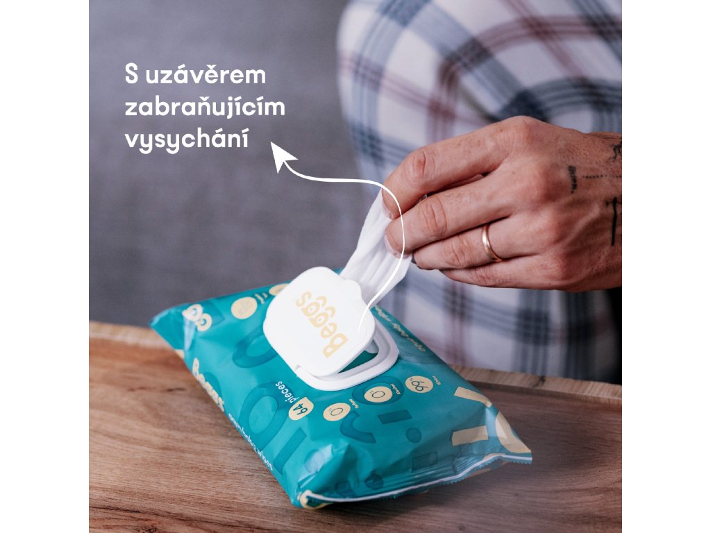 Balení je opatřeno praktickým znovuuzavíratelným víčkem, které zabraňuje vysušování ubrousků. Balení obsahuje 64 kusů ubrousků, což je množství, které většina maminek vypotřebuje během jednoho až dvou týdnů. To je doba, po kterou již jednou otevřené ubrousky nestačí vyschnout.