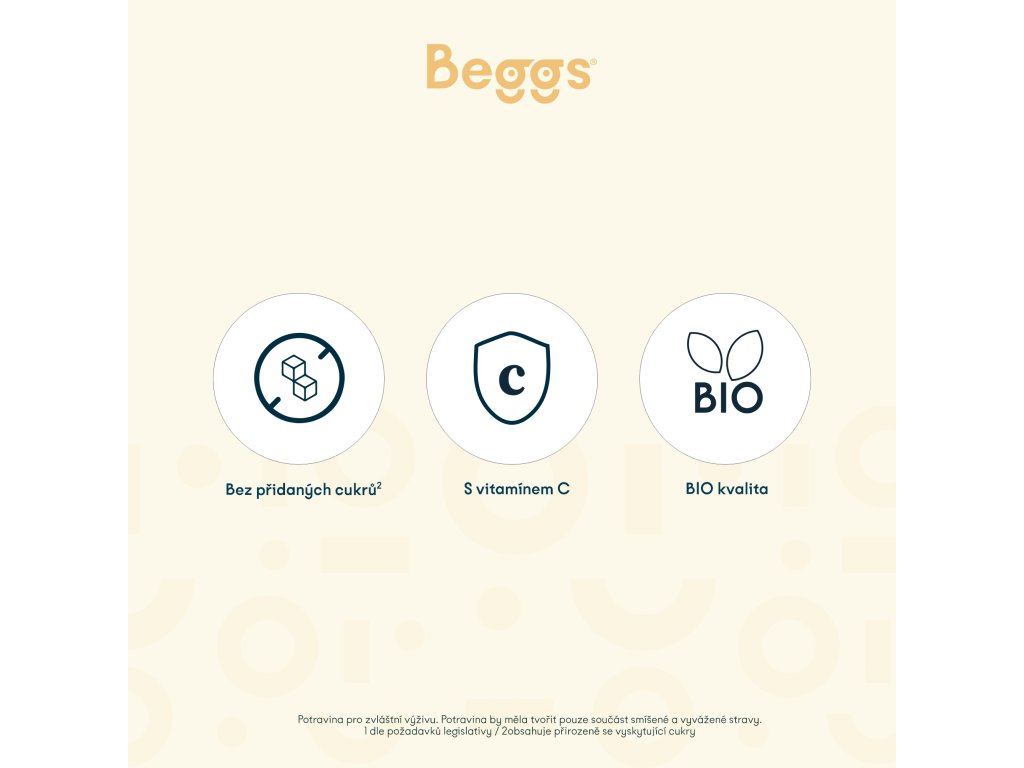 O značce: Jsme Beggs. Tvůrci a spokojení rodiče, kteří rostou se svými dětmi. Rodičovství nebereme jako povinnost. Pro nás jsou děti těmi nejlepšími učiteli. Ukazují nám, jak je v životě důležité zpomalit, být všímaví a mít radost z každého dne. Náš cíl byl jasný – vytvořit inovativní, kvalitní řadu chutných produktů, které by rozuměly dětem. Na základě toho vznikly pilotní receptury dětských mlék, příkrmů či nápojů. Jsme hrdí na to, že iniciátoři a tvůrci Beggs jsou mindfulness rodiče. Aktivní, všímaví a upřímně milující lidé, kteří žijí pro své děti tady a teď. Protože šťastné dětství začíná spokojeným rodičovstvím.