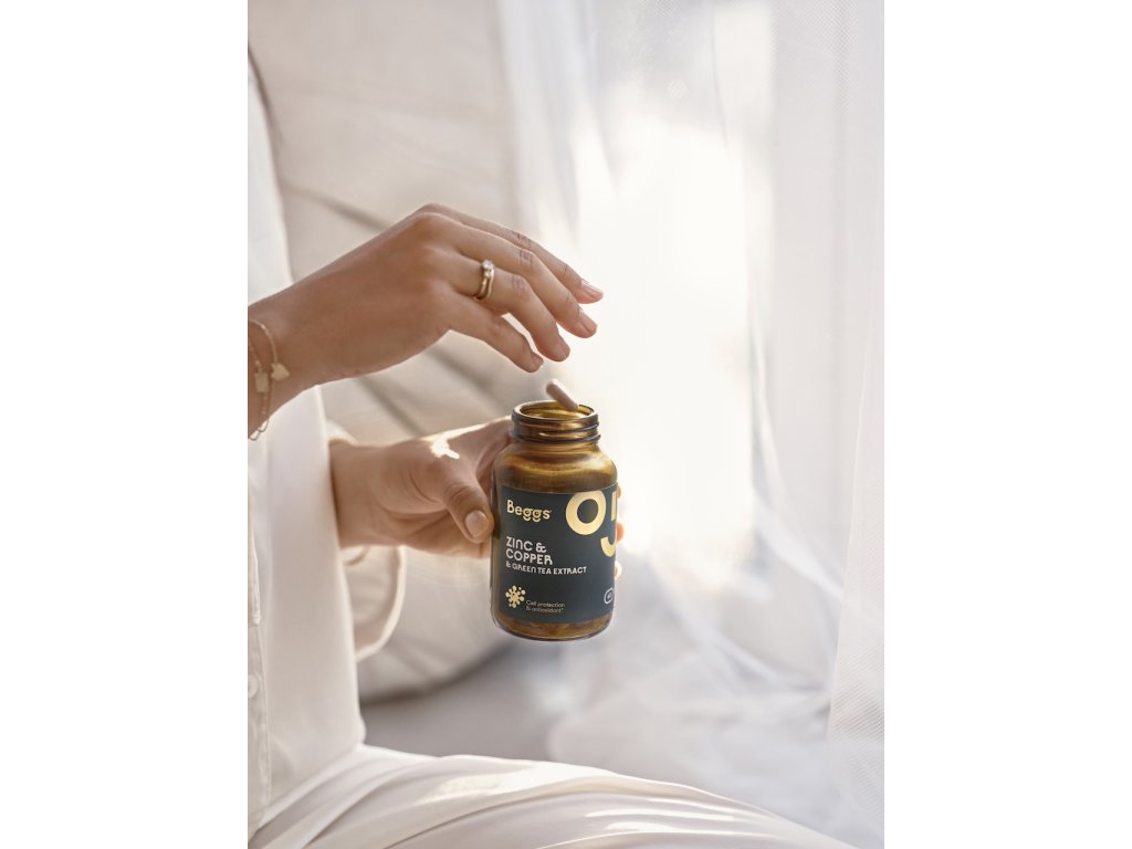 Beggs Zinc & Copper & Green Tea Extract kombinuje sílu antioxidantů a minerálů pro podporu zdraví a vitality1,2 každý den. Jedinečné spojení zinku (bisglycinát zinečnatý) a mědi (citrát měďnatý), které přispívají k ochraně buněk před oxidativním stresem, s extraktem ze zeleného čaje standardizovaným na minimálně 50 % EGCG (epigalokatechín-3-galát), známým pro své antioxidační vlastnosti a příjemné osvěžení těla. Zinek navíc udržuje zdravou paměť, pozornost a reakce.
