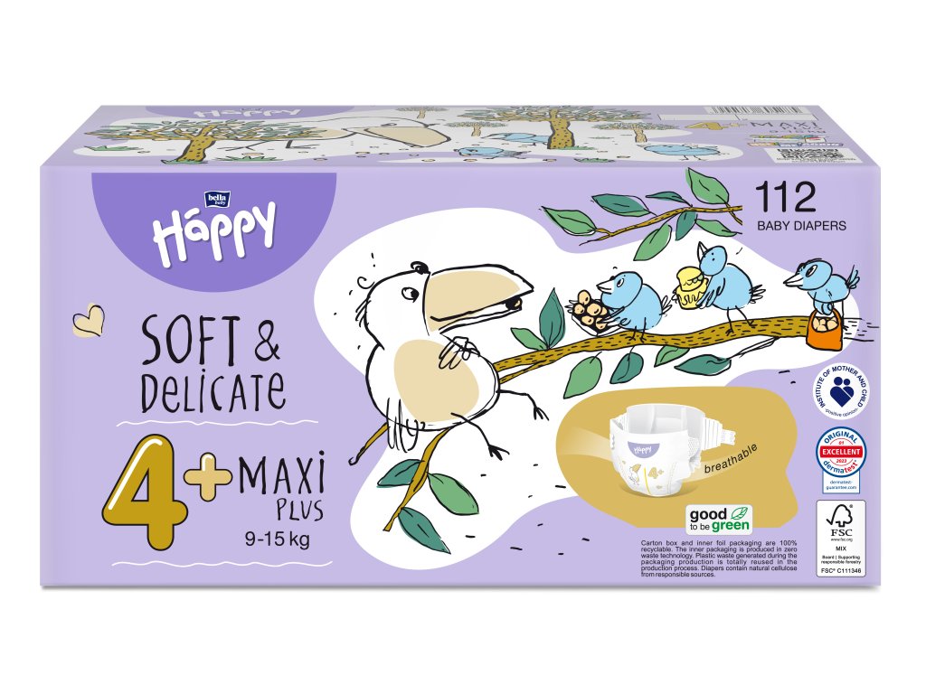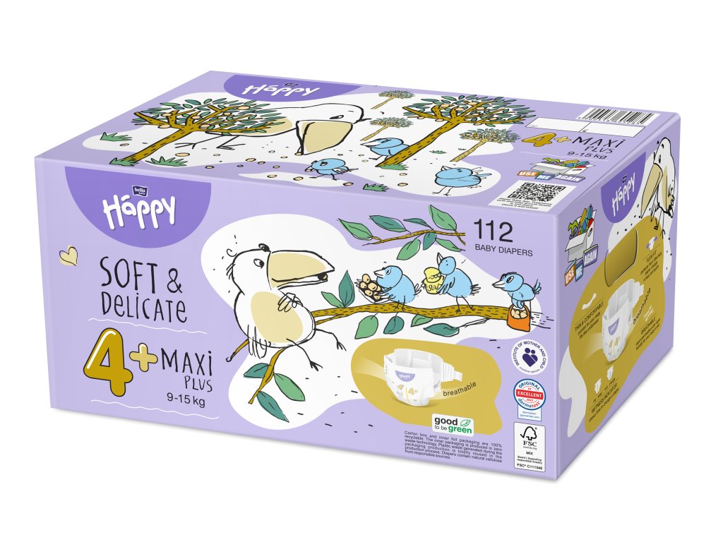 Happy Toy box ve velikosti Maxi obsahuje dvě balení plen Happy Soft & Delicate Maxi Plus, vždy po 56 kusech. Tyto pleny jsou určeny pro děti s hmotností 9–15 kg. Jsou vyrobeny z kvalitních materiálů, dokonale se přizpůsobí tělu dítěte a poskytují příjemný pocit sucha. Neobsahují žádné alergeny a minimalizují riziko vzniku opruzenin. Kartonová krabice s potiskem je použitelná jako box k uchování plen nebo dětských hraček.