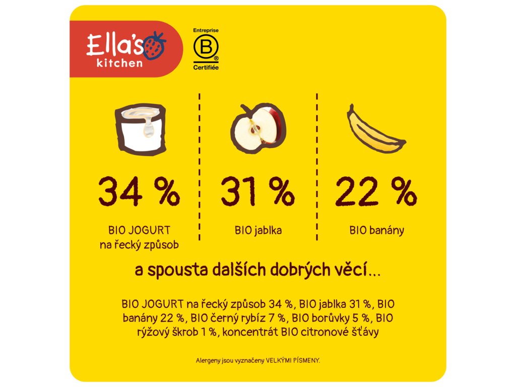 BIO JOGURT na řecký způsob 34 %, BIO jablka 31 %, BIO banány 22 %, BIO černý rybíz 7 %, BIO borůvky 5 %, BIO rýžový škrob 1 %, koncentrát BIO citronové šťávy