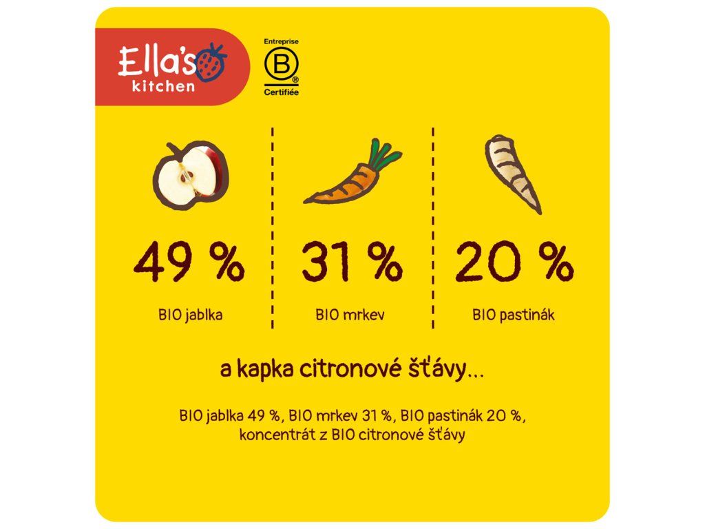BIO jablka 49 %, BIO mrkev 31 %, BIO pastinák 20 %, koncentrát z BIO citronové šťávy