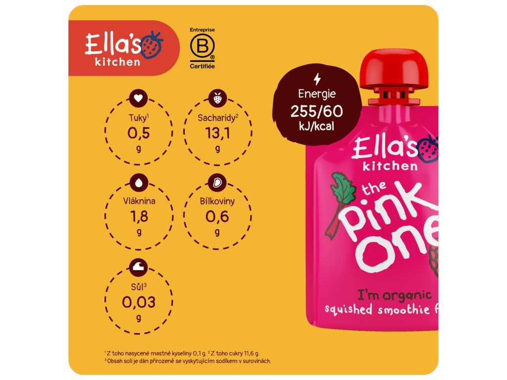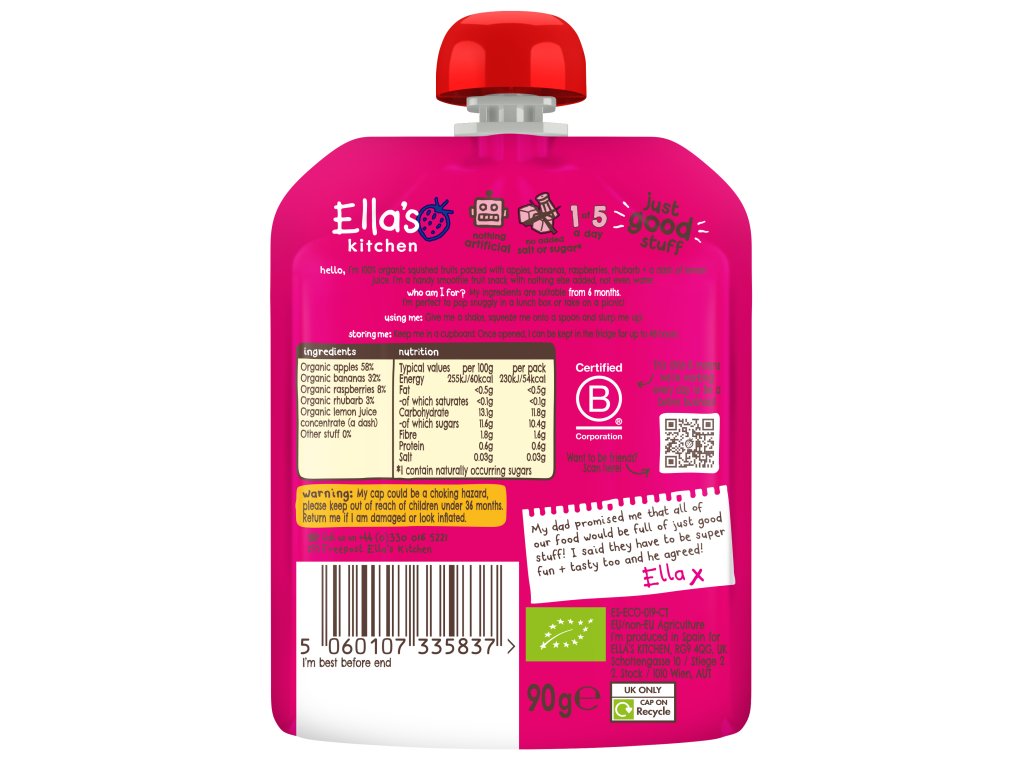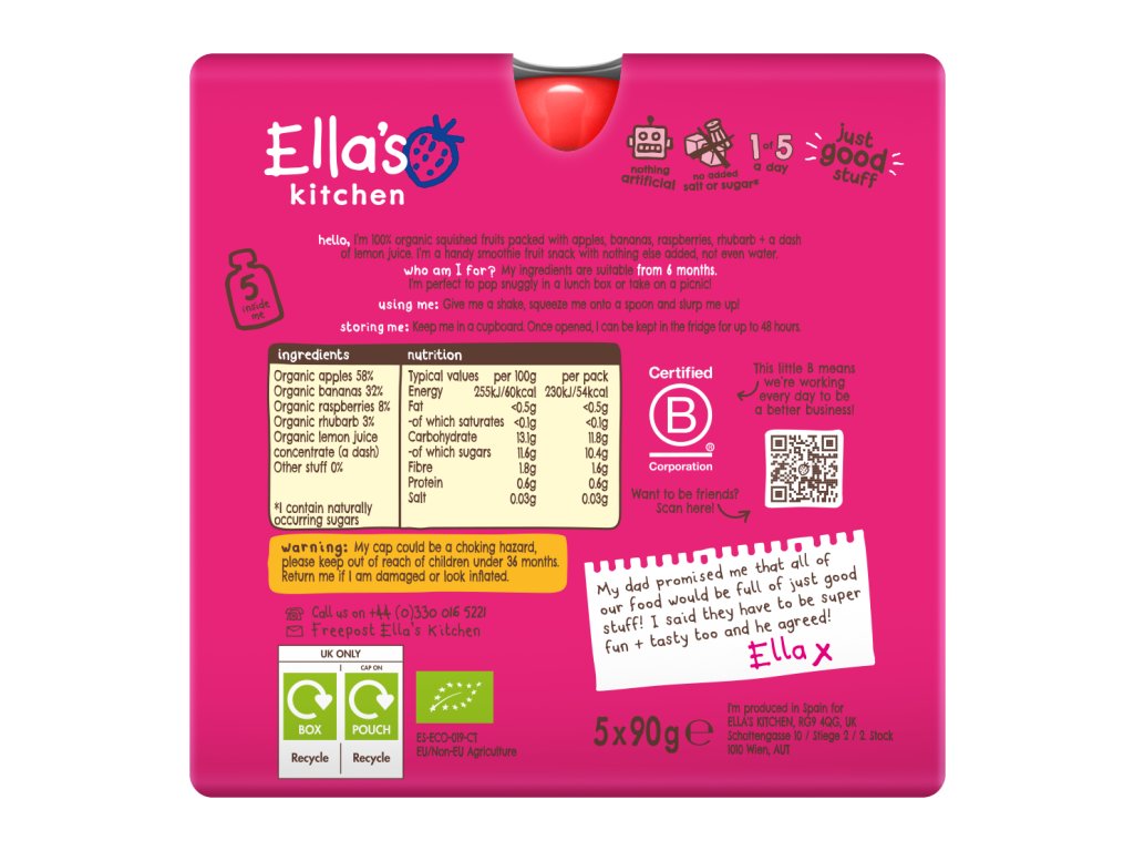 Výrobce: Ella's Kitchen Ella's Barn, 22 Greys Green Farm Rotherfield Greys Henley-on-Thames RG9 4QG, Velká Británie. Oficiální distributor: Health Academy, s. r. o., Zbraslavská 22/49, 159 00, Praha, Česká republika.