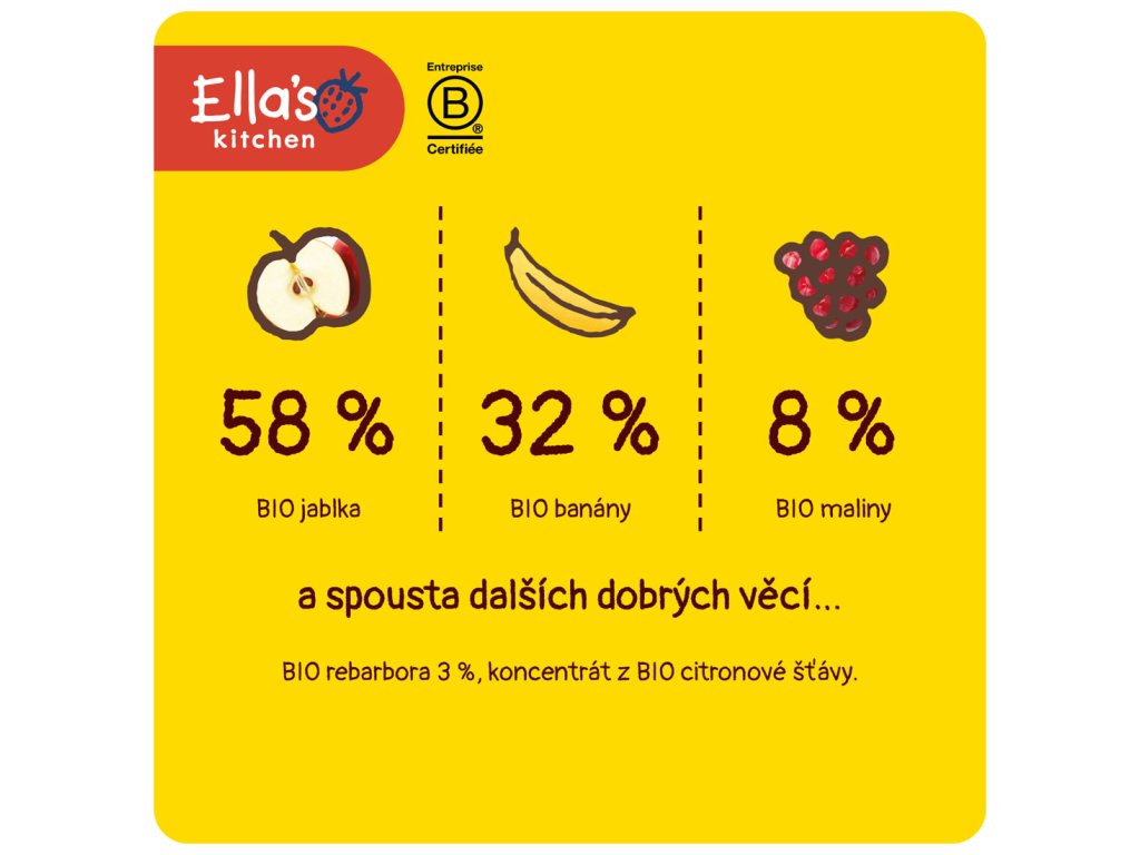 Složení: BIO jablka 58 %, BIO banány 32 %, BIO maliny 8 %, BIO rebarbora 3 %, koncentrát z BIO citronové šťávy.