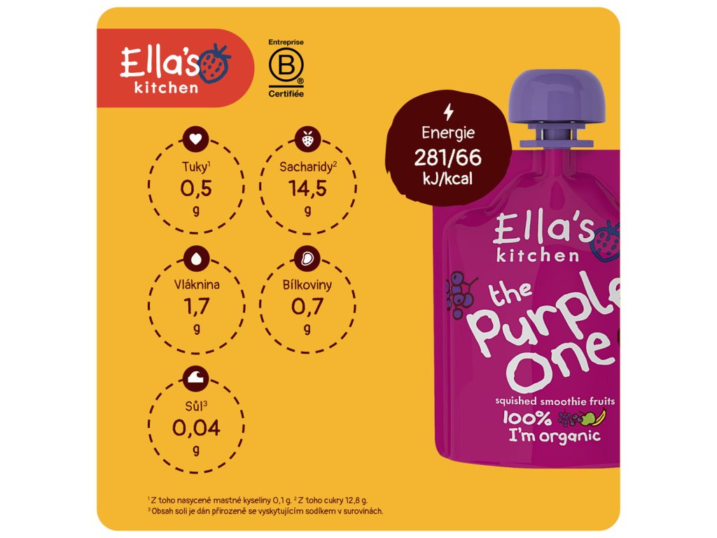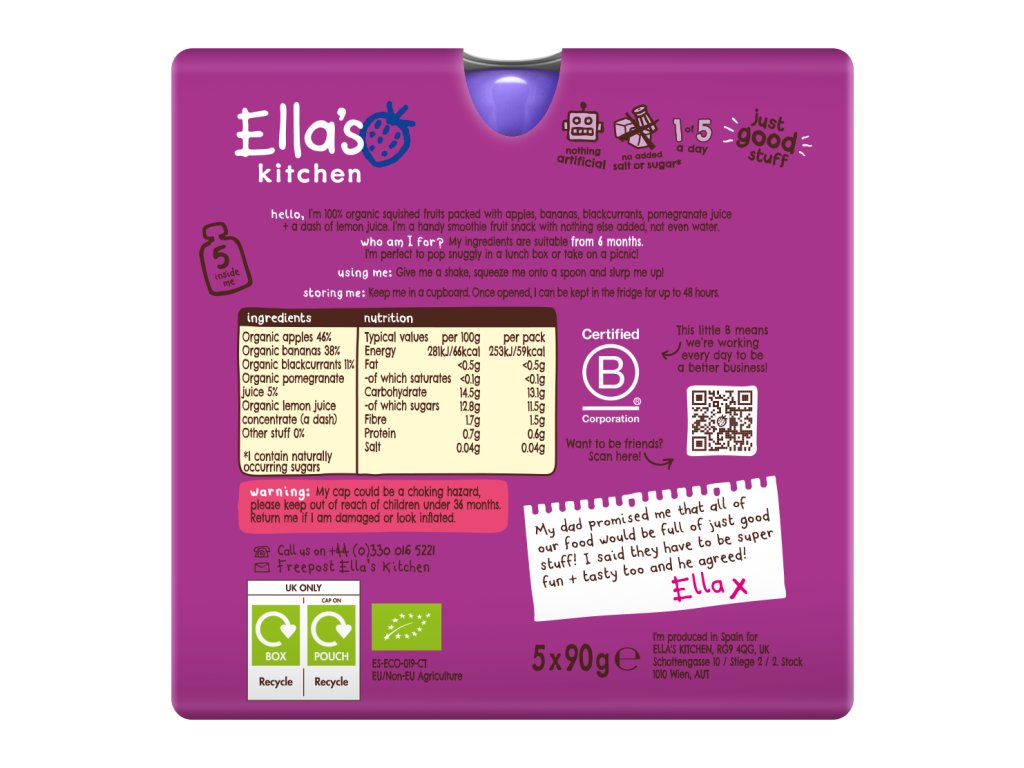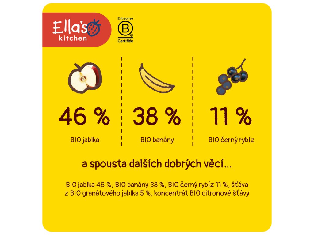 Výrobce: Ella’s Kitchen Ella’s Barn, 22 Greys Green Farm Rotherfield Greys Henley-on-Thames RG9 4QG, Velká Británie. Oficiální distributor: Health Academy, s. r. o., Zbraslavská 22/49, 159 00, Praha, Česká republika.
