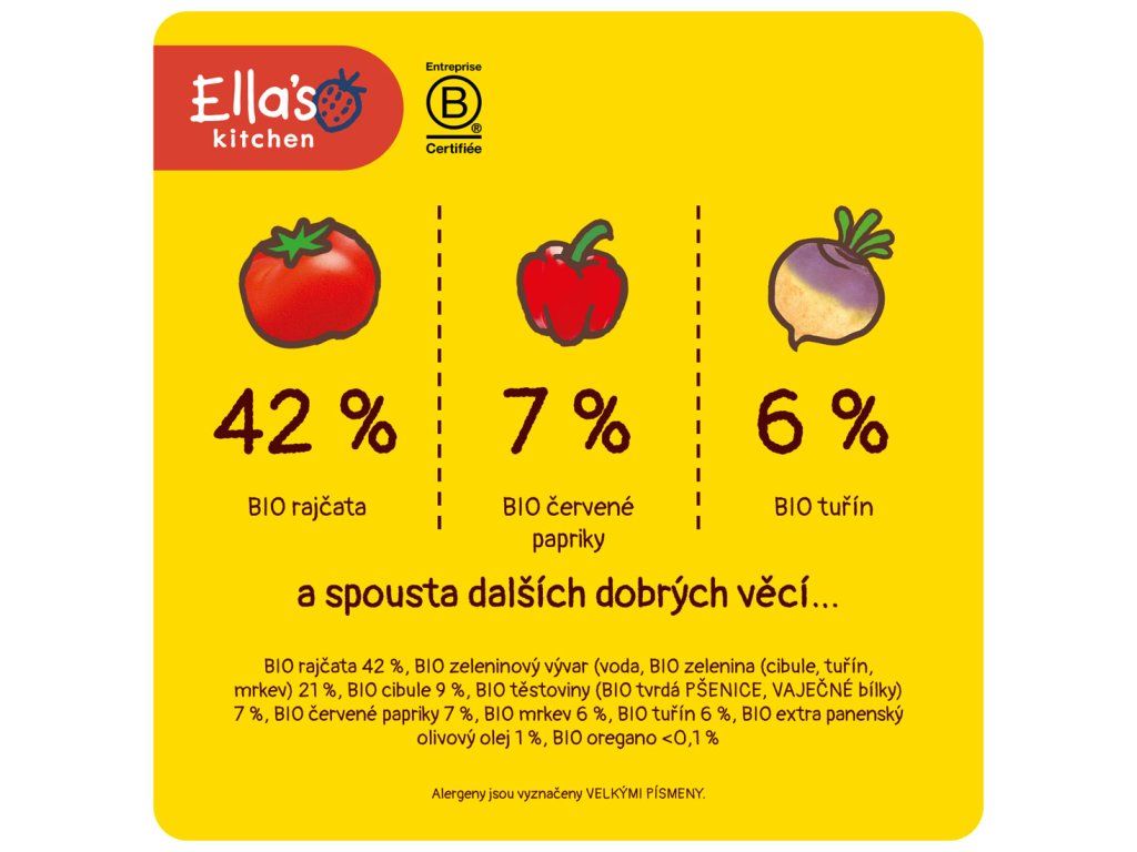 BIO rajčata 42 %, BIO zeleninový vývar (voda, BIO zelenina (cibule, tuřín, mrkev) 21 %, BIO cibule 9 %, BIO těstoviny (BIO tvrdá PŠENICE, VAJEČNÉ bílky) 7 %, BIO červené papriky 7 %, BIO mrkev 6 %, BIO tuřín 6 %, BIO extra panenský olivový olej 1 %, BIO oregano <0,1 %