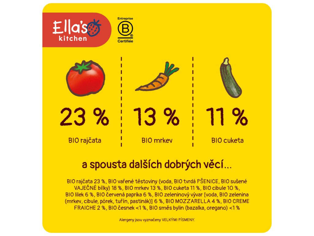 BIO rajčata 23 %, BIO vařené těstoviny (voda, BIO tvrdá PŠENICE, BIO sušené VAJEČNÉ bílky) 18 %, BIO mrkev 13 %, BIO cuketa 11 %, BIO cibule 10 %, BIO lilek 6 %, BIO červená paprika 6 %, BIO zeleninový vývar [voda, BIO zelenina (mrkev, cibule, pórek, tuřín, pastinák)] 6 %, BIO MOZZARELLA 4 %, BIO CREME FRAICHE 2 %, BIO česnek <1 %, BIO směs bylin (bazalka, oregano) <1 %