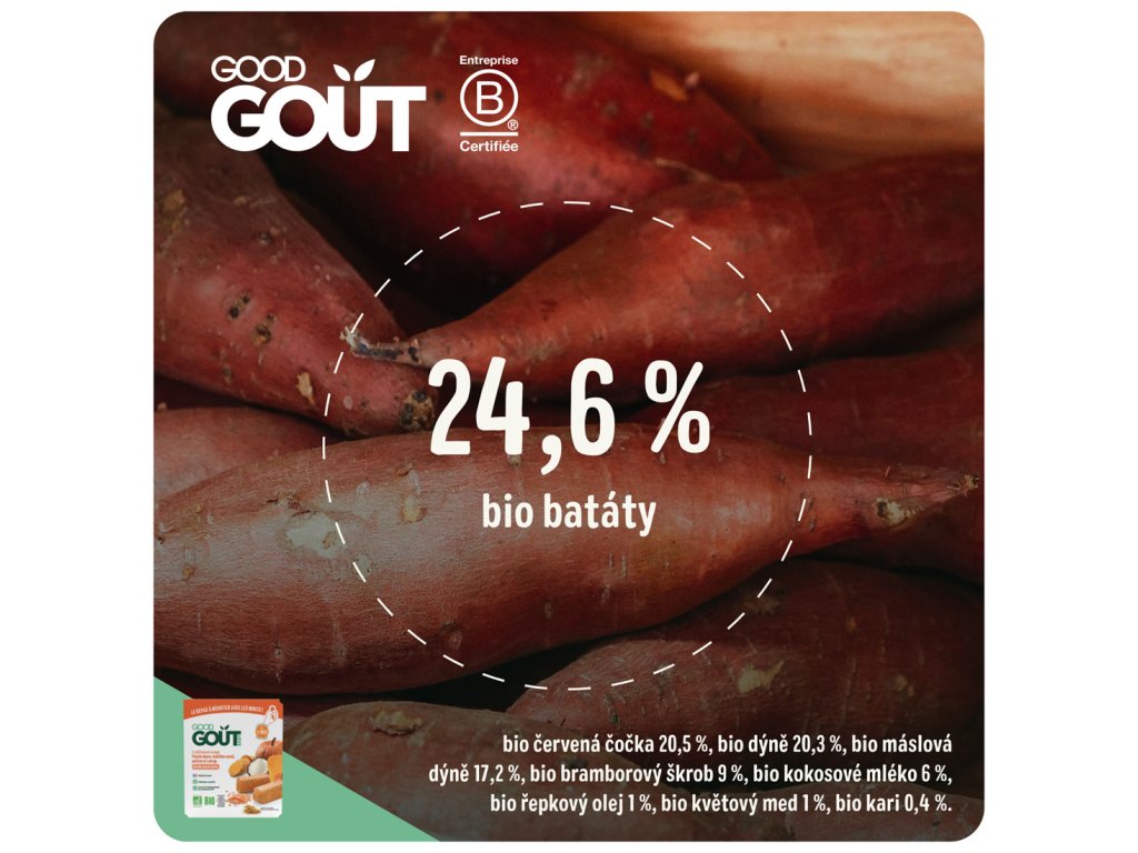bio červená čočka 20,5 %, bio dýně 20,3 %, bio máslová dýně 17,2 %, bio bramborový škrob 9 %, bio kokosové mléko 6 %, bio řepkový olej 1 %, bio květový med 1 %, bio kari 0,4 %.