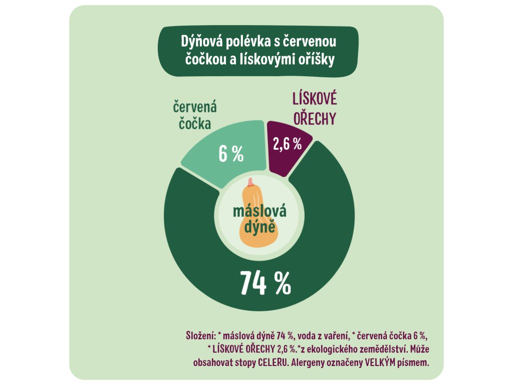 Složení: * máslová dýně 74 %, voda z vaření, * červená čočka 6 %, * LÍSKOVÉ OŘECHY 2,6 %. *z ekologického zemědělství. Může obsahovat stopy CELERU. Alergeny označeny VELKÝM písmem.