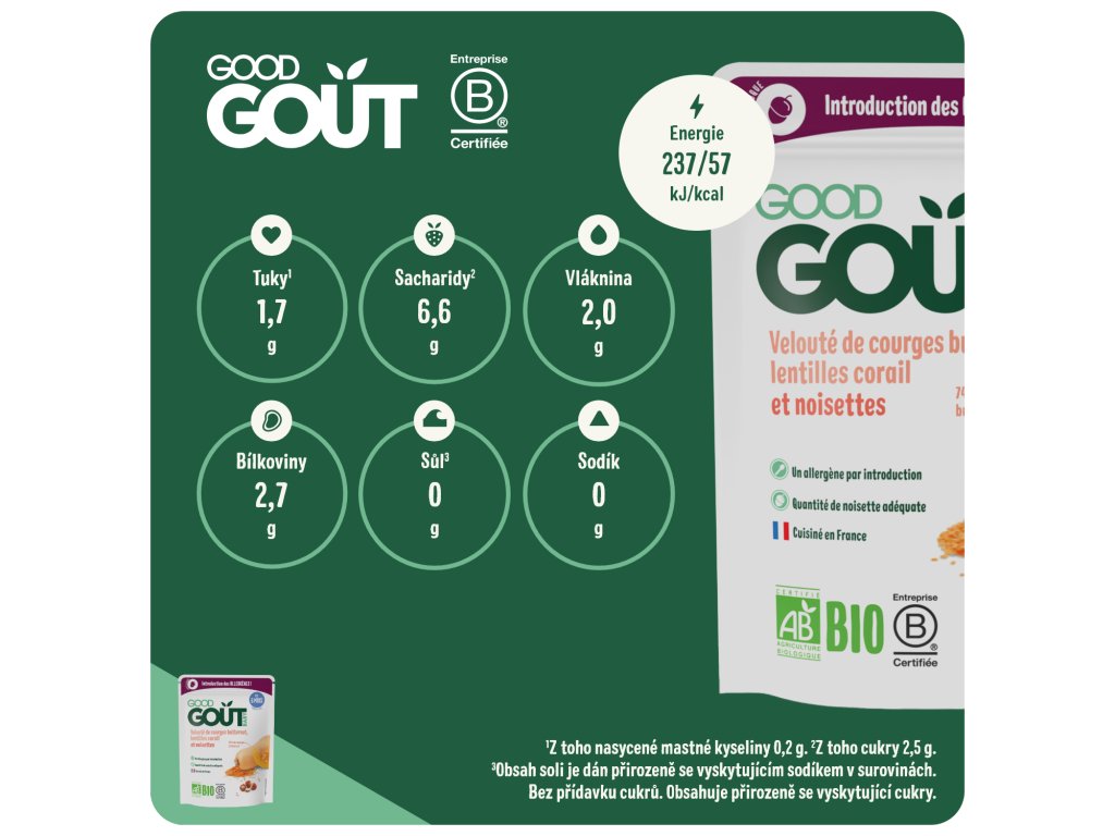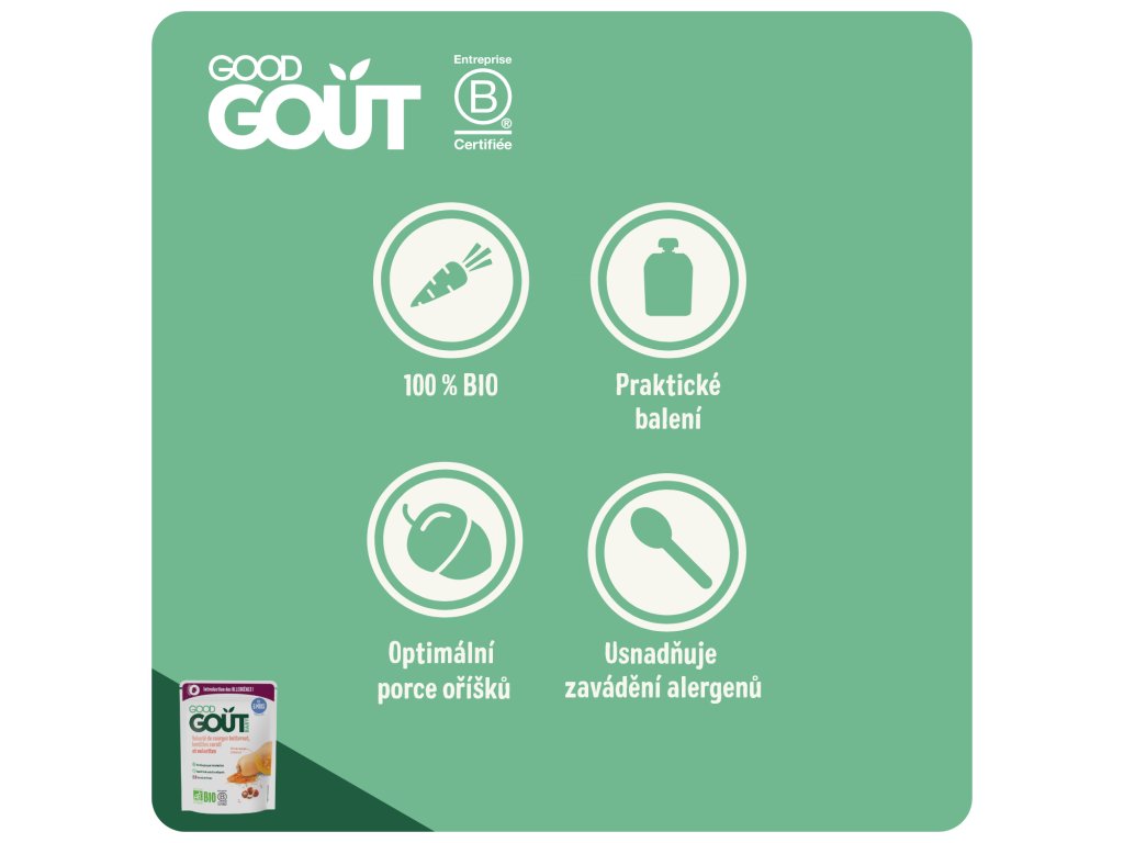 V Good Gout rádi překvapujeme dětské chuťové buňky zajímavými ingrediencemi a tím nejlepším z přírody! S lískou se sice venku běžně setkáváme, ale málokdy objevíte její plody v dětských příkrmech. Proto jsme vymysleli ideální jídlo, které miminku představí nasládlou chuť oblíbených lískových oříšků již od ukončeného 6. měsíce. A vám, rodičům, tím umožníme zavést do stravy miminka další alergen.