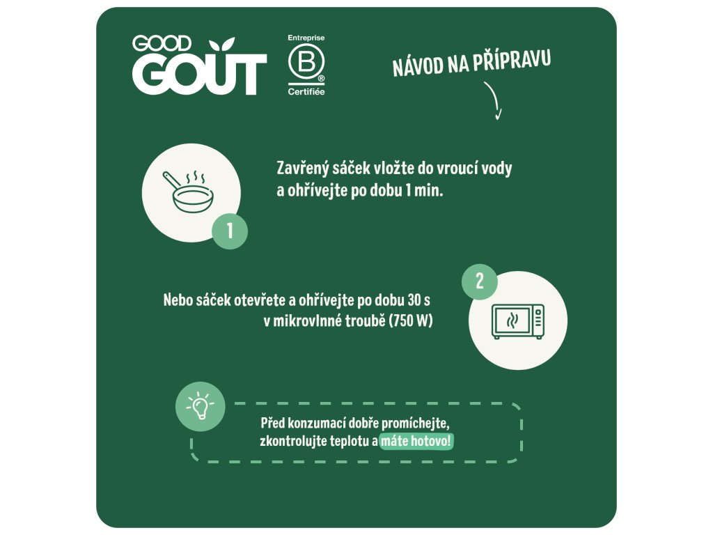 Zavřený sáček vložte do vroucí vody a ohřívejte po dobu 1 min nebo sáček otevřete a ohřívejte po dobu 30 s v mikrovlnné troubě (750 W). Před konzumací dobře promíchejte, zkontrolujte teplotu a máte hotovo!