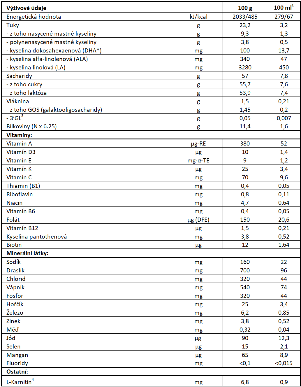 BIO plnotučné mléko (191,2 g tekutého mléka na 100 g prášku), BIO odstředěné mléko, BIO laktóza (z mléka), BIO rostlinné oleje (slunečnicový, kokosový, řepkový), BIO demineralizovaná bílkovina mléčné syrovátky, BIO galakto-oligosacharidy (z mléka) 2,1 %, mléčnan vápenatý, fosforečnan vápenatý, hydroxid draselný, vitamín C, citrát vápenatý, olej z mikrořas Schizochytrium sp., chlorid draselný, síran železnatý, vitamín E, síran zinečnatý, niacin, kyselina pantothenová, síran měďnatý, thiamin, riboflavin, vitamín A, vitamín B6, síran manganatý, kyselina listová, seleničitan sodný, jodid draselný, vitamín K, vitamín D3 , biotin, vitamín B12.