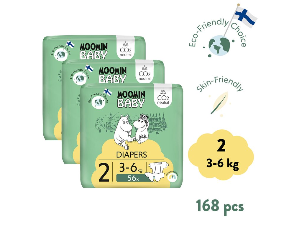 Moomin Baby 2 Newborn 3–6 kg (168 ks), měsíční balení eko plen