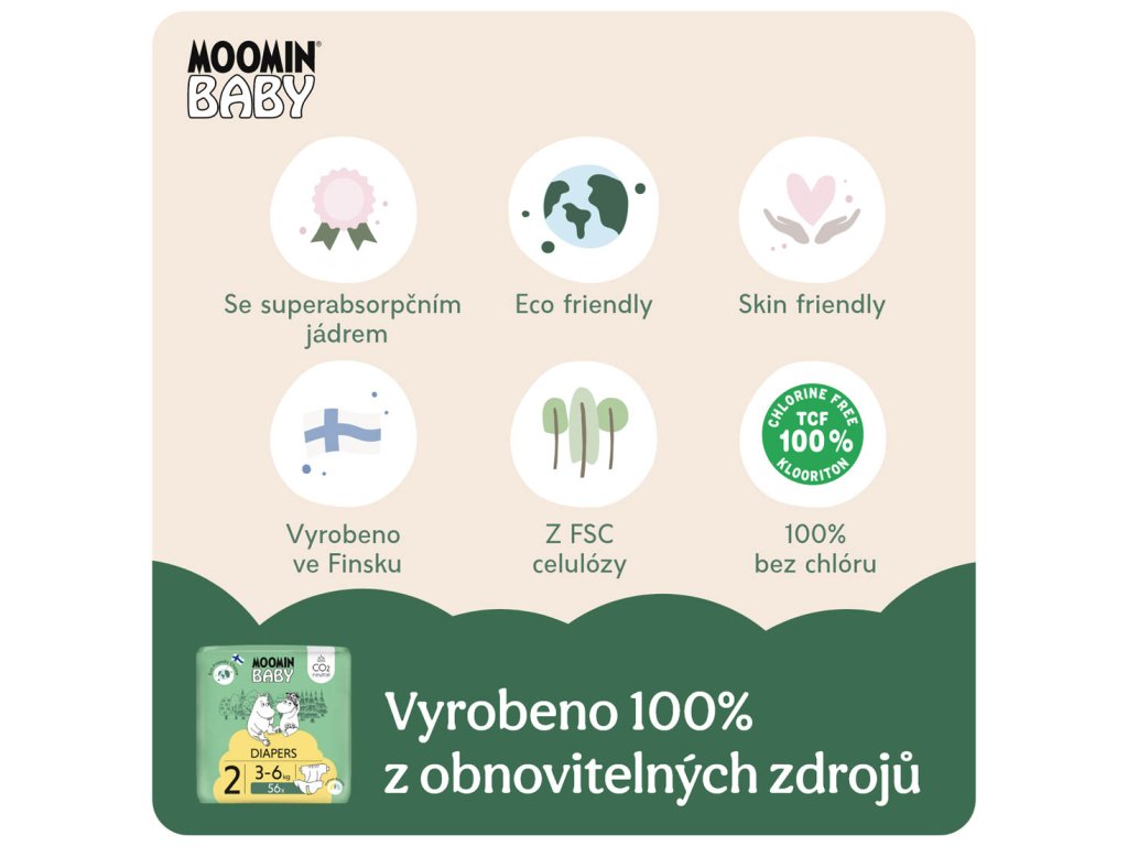 Uživateli produktů Moomin Baby jsou ti nejmladší obyvatelé planety. Proto přemýšlíme o věcech dlouhodobě a udržitelně. Na životní prostředí bereme ohled nejen při výrobě plen Moomin Baby, ale v celém jejich životním cyklu.