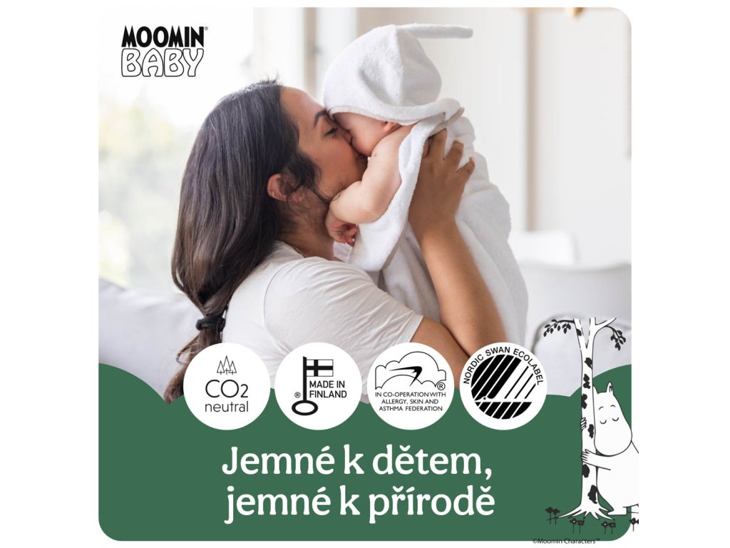 Plenky Moomin Baby jsou bezstarostnou a bezpečnou volbou pro vaše dítě, protože všechny suroviny použité k jejich výrobě splňují přísná kritéria stanovená environmentální značkou Nordic Swan Ecolabel a Finskou federací pro alergie, kůži a astma. Jsou bez parfemace a neobsahují chlór nebo glyfosáty, které by mohly dráždit citlivou dětskou pokožku.