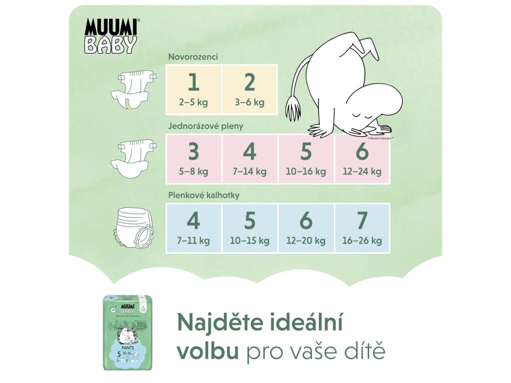 Velikosti plen Muumi Baby jsou založeny na hmotnosti dítěte. Na obalu i samotné pleně najdete jasné označení velikosti.