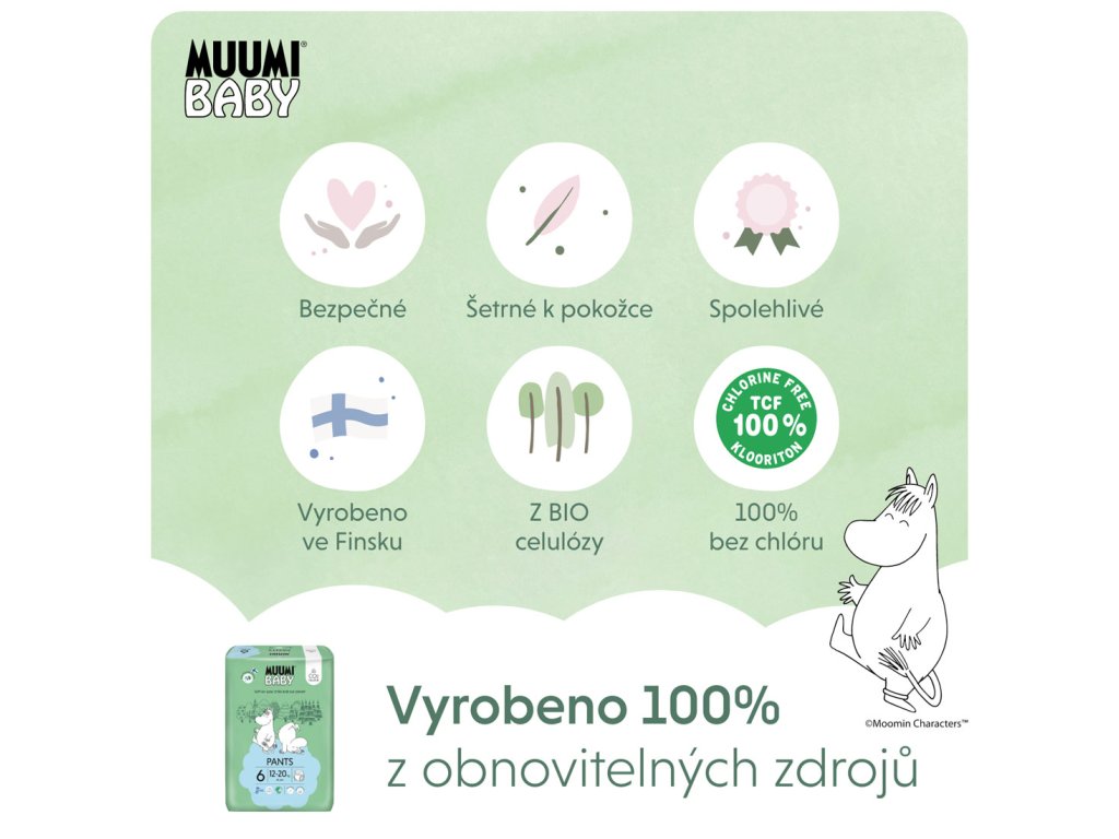 Při počítání, jak moc velkou zátěž pleny pro životní prostředí představují, je zapotřebí vzít v úvahu celý životní cyklus plenky, a to od suroviny až po výrobu a její likvidaci. Plenky Muumi Baby jsou vyrobeny z pečlivě vybraných surovin od lokálních výrobců. Finská celulóza v plenkách Muumi Baby je zcela bez chlóru a je bělená pomocí 100% čistého kyslíku. Jedná se o nejbezpečnější řešení pro životní prostředí i pro pokožku miminek. Plenky Muumi Baby neobsahují chlór, takže je lze likvidovat jako běžný odpad. Obal je vyroben z 25 % recyklovaného plastu a lze jej opět recyklovat.