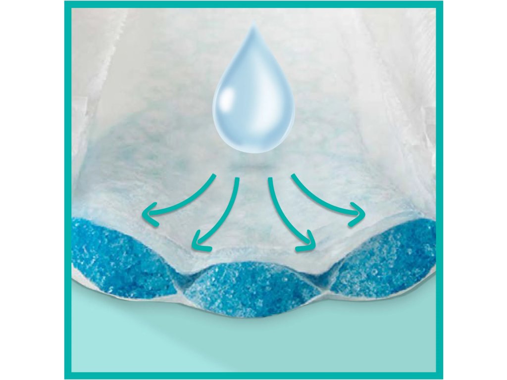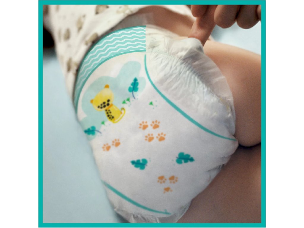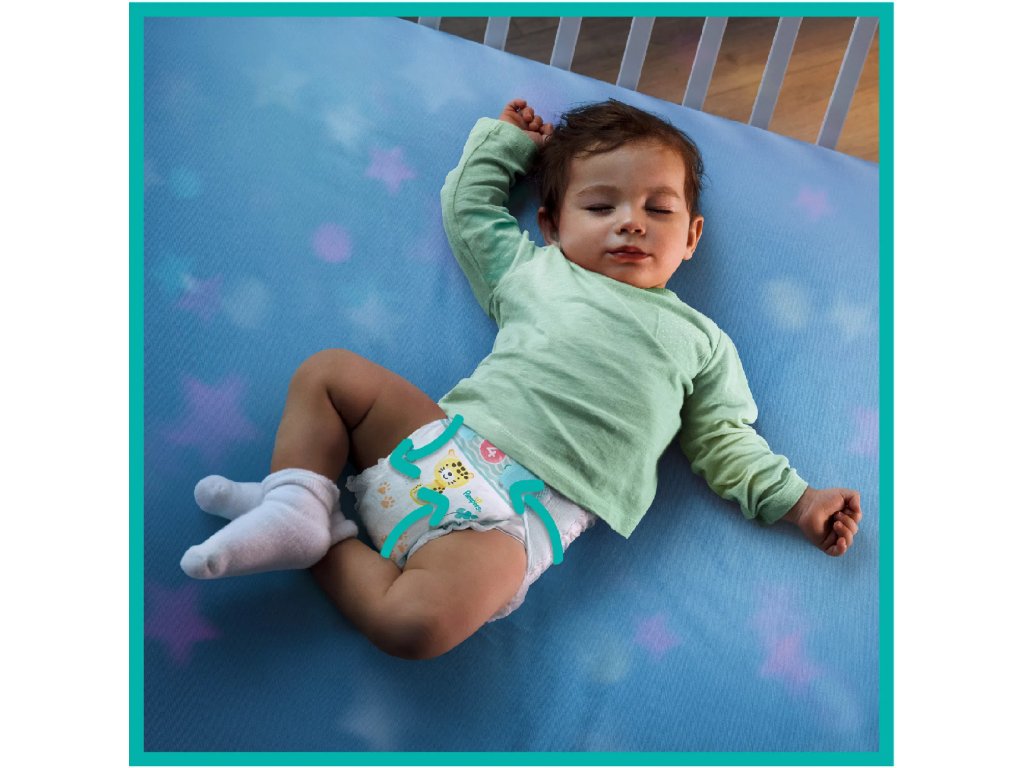 Jednorázové plenky Pampers Active Baby s absorpční vrstvou Sleep pro děti o hmotnosti 6 až 10 kg. Dvojitá absorpční vrstva Extra Dry poskytuje až 12 hodin nerušeného spánku. Pružné boky se roztáhnou až o 8 cm a přizpůsobují se zvětšování a zmenšování dětského bříška.