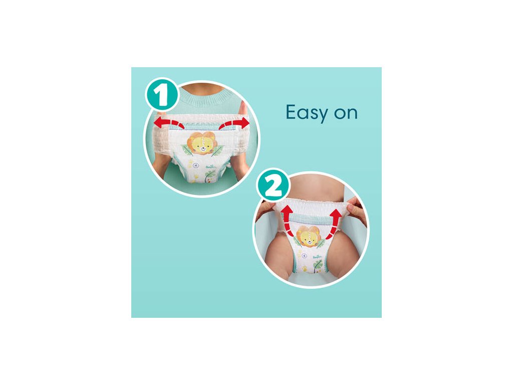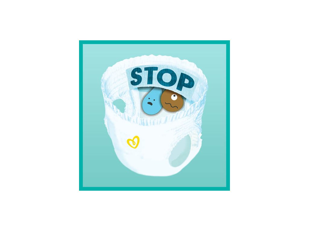 Plenkové kalhotky pro děti s hmotností 6 až 11 kg mají jedinečnou kapsu Stop & Protect, která spolu s pružným pasem poskytuje dítěti až 12 hodin ochrany proti protečení, ať už si hraje nebo spí. Absorpční jádro ihned absorbuje tekutinu a dvojité bezpečnostní manžetky pomáhají předcházet protečení kolem nožiček.