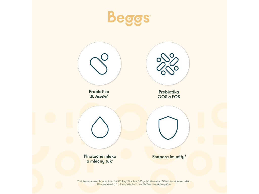 Důležité upozornění: Kojení je nejlepší způsob výživy kojenců. Beggs 2 je vhodné pouze pro kojence starší než 6 měsíců a má tvořit pouze část smíšené stravy a nemá být používáno jako náhrada mateřského mléka během prvních 6 měsíců života. Rozhodnutí o zahájení podávání příkrmů, včetně jakékoli výjimky z pravidla věku 6 měsíců, by mělo být přijímáno pouze na radu nezávislých osob kvalifikovaných v lékařství, výživě nebo farmacii nebo jiných odborníků odpovědných za péči o matku a dítě, v závislosti na individuálním růstu a rozvojových potřebách konkrétního kojence. Dbejte na hygienu ústní dutiny kojence. Dodržujte pokyny pro přípravu a skladování, jinak ohrozíte zdraví kojence.