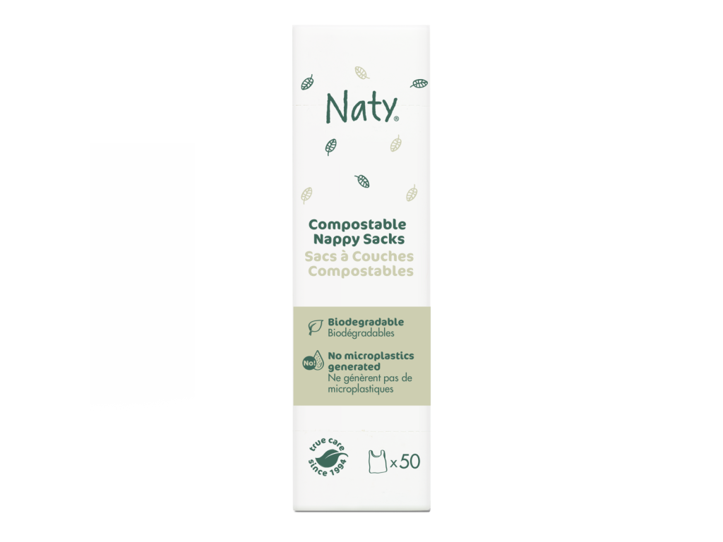 Ekologické sáčky na použité plenky Naty jsou vyrobené ze 100 % přírodních materiálů za použití enviromentálně šetrných zdrojů. Snadno se rozkládají a jsou plně kompostovatelné. Neobsahují chlór, latex, TBT (tributylin) ani parfémy.