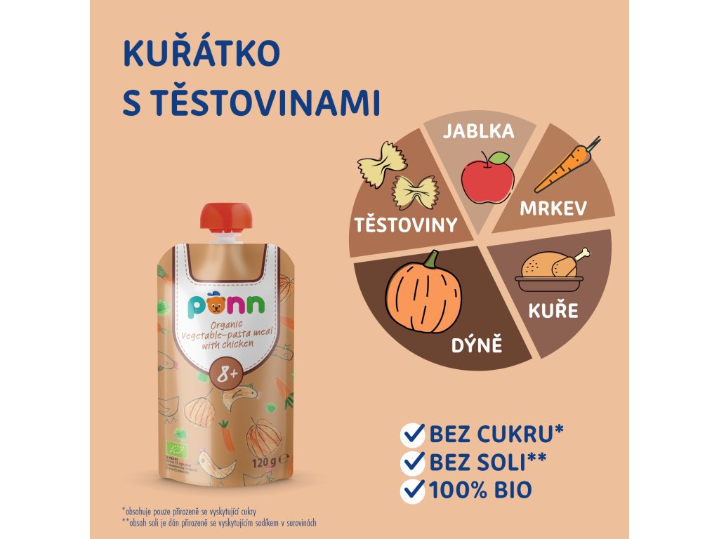 Šťavnatá kuřecí prsíčka, dýně, jablečné pyré, mrkev a těstoviny, to všechno BIO kvalitě, tvoří náplň kapsičky, která je opatřena praktickým uzávěrem pro případ, že by snad vaše dítě nezvládlo spořádat celou tuto dobrotu najednou. Výrobek je tepelně opracovaný a jeho trvanlivost zajišťuje šetrná sterilizace. Příkrm byl vyvinut ve spolupráci s pediatričkou.