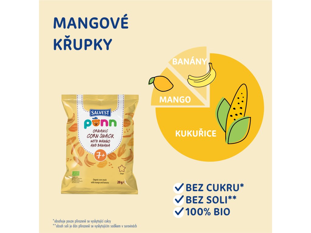 Lahodné mangové křupky potěší všechny malé mlsouny, kterým už bylo 7 měsíců. Aby byly nejen co nejchutnější, ale zároveň i co nejprospěšnější, obohatili jsme je o vitamín B1. Pro hledače nových chutí jsme pak k mangu přidali i sušený banán a kapku slunečnicového oleje. Základ tvoří kukuřičná krupička, která je přirozeně bezlepková a je základem pro správné fungování střevní mikroflóry. Speciální tvar křupek napomáhá rozvoji jemné dětské motoriky.