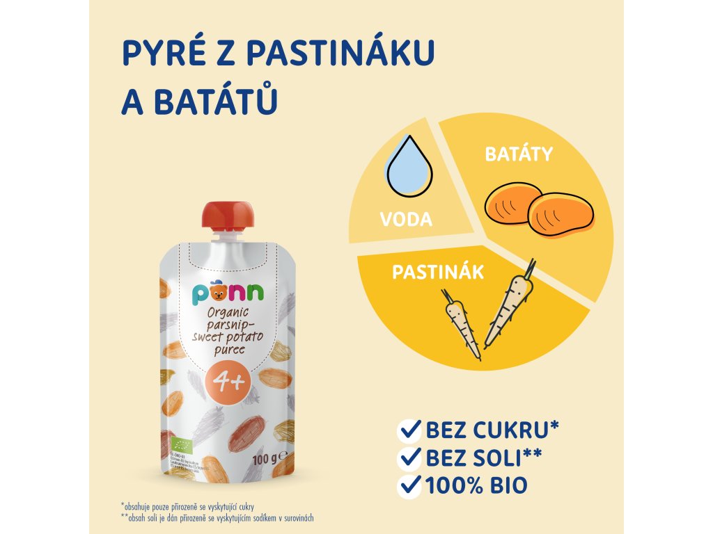 BIO zeleninové pyré se skládá pouze ze dvou surovin – pastináku a batátů z kontrolovaného ekologického zemědělství. Je tak skvělou volbou pro miminka, která právě začala jíst dětskou výživu, ale také skvělá volba pro starší děti jako zdravá svačina. Neobsahuje přidaný cukr ani žádné jiné přísady, je bez lepku a laktózy. Doporučeno pro miminka od ukončeného 4. měsíce věku. Vyrobeno s láskou a respektem k životnímu prostředí.