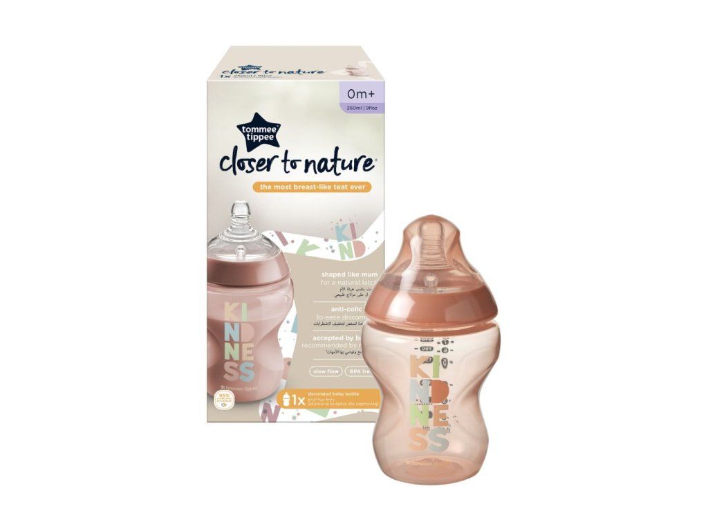 Kojenecká lahvička Tommee Tippee Closer To Nature s unikátní silikonovou savičkou, která svým tvarem a vlastnostmi připomíná mateřský prs. Teplou tekutinou uvnitř lahvičky se savička zahřeje na příjemnou teplotu, měkký a pružný konec savičky připomíná mateřskou bradavku. Dítě tak téměř nepociťuje rozdíl mezi kojením a krmením z této lahvičky. Lahvička je antikoliková, opatřená malým ventilačním otvorem na okraji savičky, který citlivě zabezpečí únik vzduchu z láhve, tím umožní plynulé sání tekutiny a zároveň snižuje riziko břišní koliky. Neobsahuje Bisfenol A.