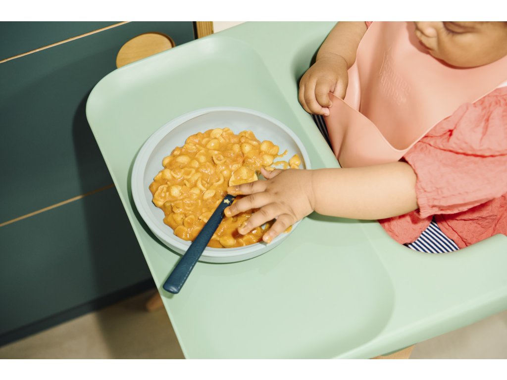 Zvýšená rukojeť udržuje lžičku (a jídlo) mimo kontakt s povrchy pro hygieničtější stolování a méně nečistot