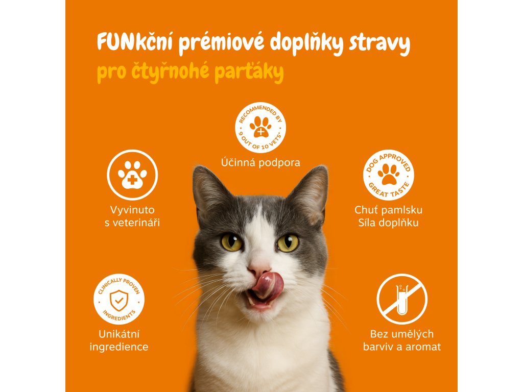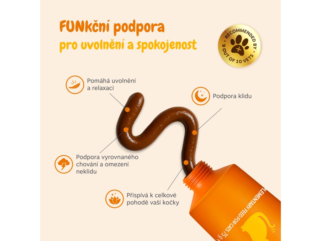 Pomozte své kočce zůstat v pohodě i v náročných chvílích! Tato prémiová FUNkční pasta, vyvinutá ve spolupráci s veterináři, spojuje lahodnou chuť, hravou formu podávání a pečlivě vybrané ingredience, které podporují klidné a vyrovnané chování – bez ospalosti. Funkční složení s L-Theaninem a patentovanou složkou Lactium® pomáhá vaší kočce zůstat uvolněná při stresu, změnách prostředí nebo návštěvě veterináře.